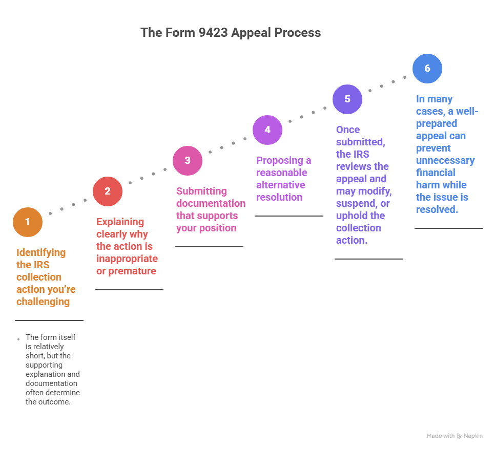 In many cases, taxpayers have the right to challenge how the IRS is collecting a tax debt before enforcement continues. One of the fastest ways to do this is through IRS Form 9423, also known as a Collection Appeal Request.